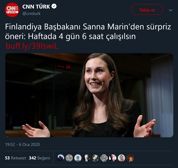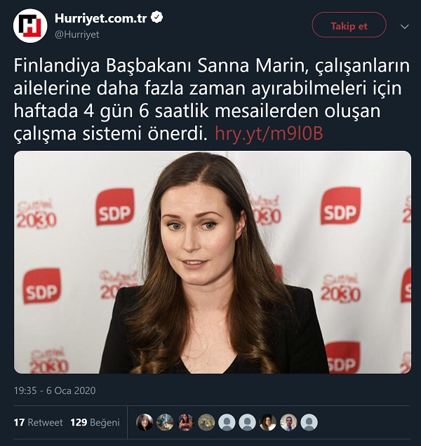 Finlandiya’nın 34 yaşındaki yeni başbakanı Sanna Marin’in Finlandiya’da haftada dört gün, günde altı saat çalışma sistemine geçileceği yönünde bir açıklama yaptığı iddiasıyla servis edilen haberlerin aktarımı ne yazık ki doğruyu yansıtmıyor. Finlandiya’nın “haftada 4 gün ve günde 6 saat” çalışma süresini denemeye başlayacağı iddiası, Başbakan Marin’in Finlandiya Sosyal Demokrat Parti’nin (SDP) 120. yılı kutlamalarında 19 Ağustos 2019 tarihinde yaptığı konuşmanın yanlış anlaşılması yahut çarpıtılmasının sonucu oluşmuştu.