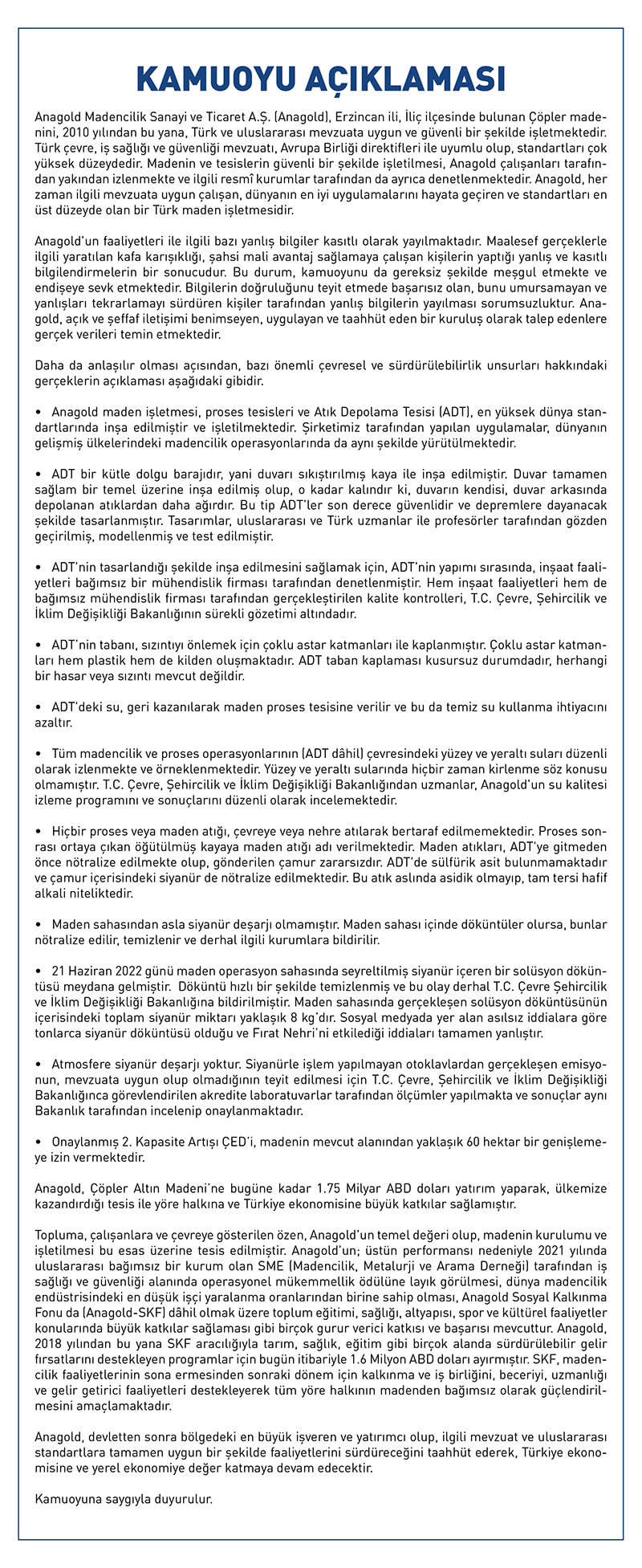 “21 Haziran 2022 günü maden operasyon sahasında seyreltilmiş siyanür içeren bir solüsyon döküntüsü meydana gelmiştir. Döküntü hızlı bir şekilde temizlenmiş ve bu olay derhal T.C. Çevre Şehircilik ve İklim Değişikliği Bakanlığına bildirilmiştir. Maden sahasında gerçekleşen solüsyon döküntüsünün içerisinde toplam siyanür miktarı 8 kg’dır. Sosyal medyada yer alan asılsız iddialara göre, tonlarca siyanür döküntüsü olduğu ve Fırat Nehri’ni etkilediği iddiaları tamamen yanlıştır.”
