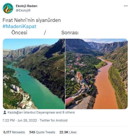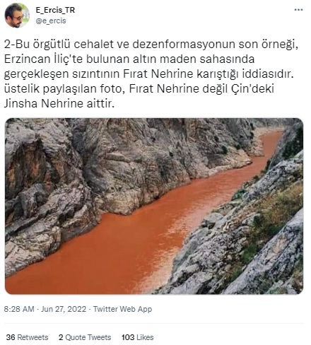 Bu örgütlü cehalet ve dezenformasyonun son örneği, Erzincan İliç’te bulunan altın maden sahasında gerçekleşen sızıntının Fırat Nehrine karıştığı iddiasıdır. üstelik paylaşılan foto, Fırat Nehrine değil Çin’deki Jinsha Nehrine aittir.
