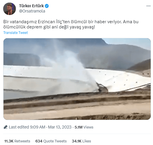 ‘’…#Erzincan #İliç’teki madenden sızan 20 ton siyanürün Fırat Nehri’ne karıştığı Jandarma tutanaklarına geçmiş!…’’ şeklinde paylaşımda bulunulduğu görülmüştür.