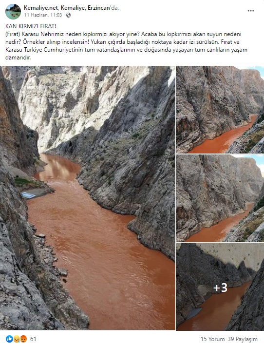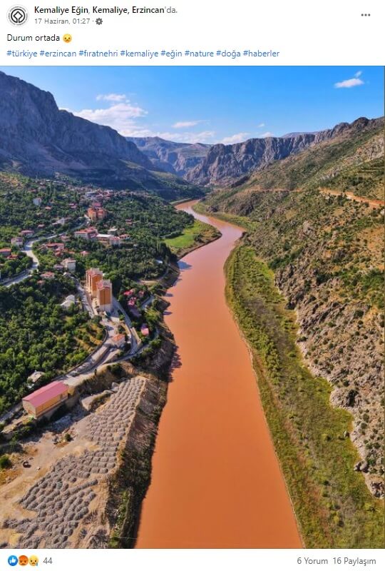 İLAVE: Yine Fırat’ın siyanür sızıntısı nedeniyle kızıllaştığı anı yansıttığı iddiasıyla paylaşılan bir diğer görsel de bahsi geçen hadiseden önce (Kemaliye Eğin adlı Facebook profilinde 17 Haziran günü) aktarılmış.
