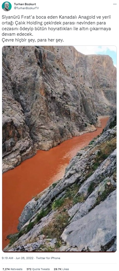 “Olay doğru ama sağdaki görsel doğru değil. Fırat’ın debisi 356 m³/sn, karışan zehir 23m³ yani 32 ton. Zira koca nehri bu renge döndüremeyeceği gibi siyanür de renksizdir. Yapmayın, haklı mücadeleyi bunlarla kirletmeyin.”