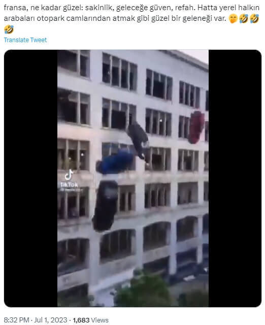 Nefes (@sonbahar1938): “fransa, ne kadar güzel: sakinlik, geleceğe güven, refah. Hatta yerel halkın arabaları otopark camlarından atmak gibi güzel bir geleneği var. 🤭🤣🤣”