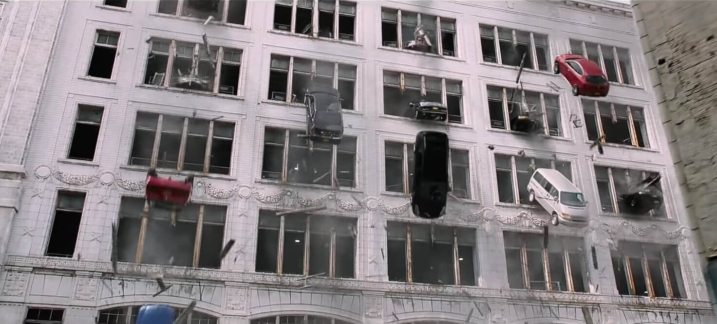 CGI da kullanılan sahnede binalardaki rampalara yerleştirilen otomobiller sırayla serbest bırakılmış ya da vinç yardımıyla düşürülmüş.