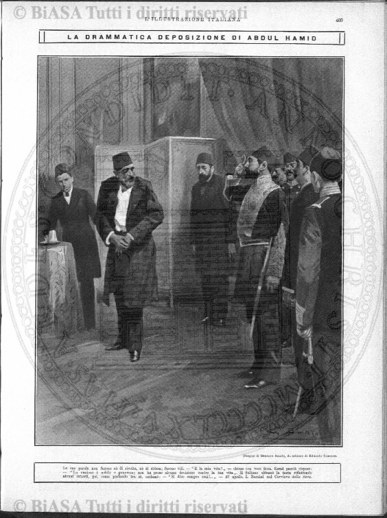 Çizimin aslı L’Illustrazione Italiana adlı yayının 1909 yılı Mayıs ayındaki sayısında “Abdul Hamid’in Dramatik İfadesi” (“La Drammatica Deposizione Di Abdul Hamid“) başlığıyla yayımlanmıştı.
