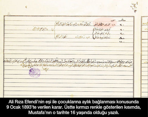 Ali Rıza Efendi’nin eşi Zübeyde Hanım ile çocuklarına aylık bağlanması hakkında Osmanlı Arşivleri’nde bulunan 9 Ocak 1893 tarihli bir belgede Zübeyde Hanım’ın dilekçesi akabinde kendisi ile üç çocuğuna yirmişer kuruş aylık bağlanması kararlaştırılmış. Bahse konu aylığın (Mustafa Kemal’in 20 yaşına gelmesi ya da bir işe girmesine, Makbule ve Naciye için ise evlenmelerine değin ödeneceği belirtilmiş (Bu belgeden yola çıkılarak ayrıca, Atatürk’ün 1881’de değil, 1877’de doğduğu iddia edilmiştir).