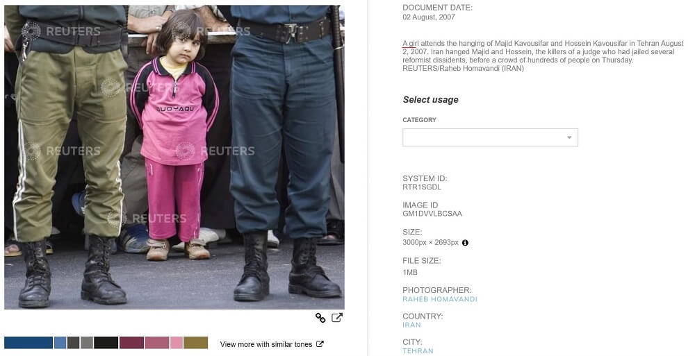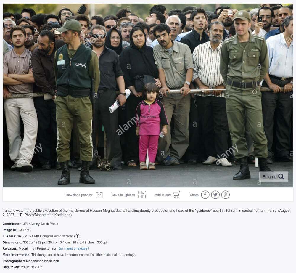 Alamy adlı stok fotoğraf sitesinde de idamı izleyen pembe renkte giyinmiş küçük kızın farklı bir açılardan fotoğrafları -herhangi bir isim zikredilmeksizin ve Majid Kavousifar ile bağına değinilmeksizin- yer almaktadır.