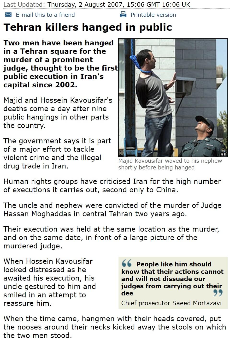 Majid Kavousifar ve yeğeni Hossein Kavousifar, İranlı hakim Masoud Ahmadi Moghaddasi’yi 2005 yılı Ağustos ayında öldürme suçundan dolayı 2 Ağustos 2007 tarihinde İran’ın Tahran meydanında asılarak idam edilmişti. 5 yıllık idamsız sürecin ardından gerçekleştirilen kamuya açık bu idam, Tahran halkının yoğun ilgisini cezbetmişti.
