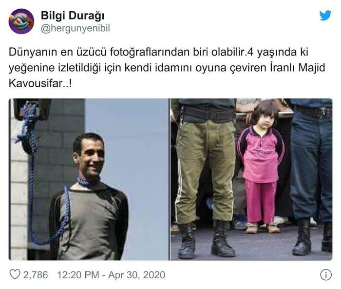 “Dünyanın en üzücü fotoğraflarından biri olabilir.4 yaşında ki yeğenine izletildiği için kendi idamını oyuna çeviren İranlı Majid Kavousifar..!”