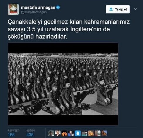 Yeni Şafak Gazetesi yazarı Mustafa Armağan, 2017 yılında Çanakkale Zaferi’nin yıl dönümü vesilesiyle attığı “Çanakkale’yi geçilmez kılan kahramanlarımız savaşı 3.5 yıl uzatarak İngiltere’nin de çöküşünü hazırladılar” metnine sahip bir sosyal medya paylaşımında, Nazi Ordusundan Müslüman askerleri gösteren fotoğrafın Çanakkale’den olduğunu iddia etme hatasına düşmüştü (Armağan, bu paylaşımını gelen tepkilerin ardından silmişti).