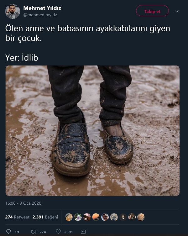Sosyal medyada son günlerde paylaşılan çamurlar içinde ayağına büyük gelen 2 farklı ayakkabıyı giyen bir küçüğün görüntülendiği fotoğrafın İdlib’te ölen anne ve babasının ayakkabılarını giyen bir çocuğa ait olduğu yönünde bir hikâye uydurulmuş.