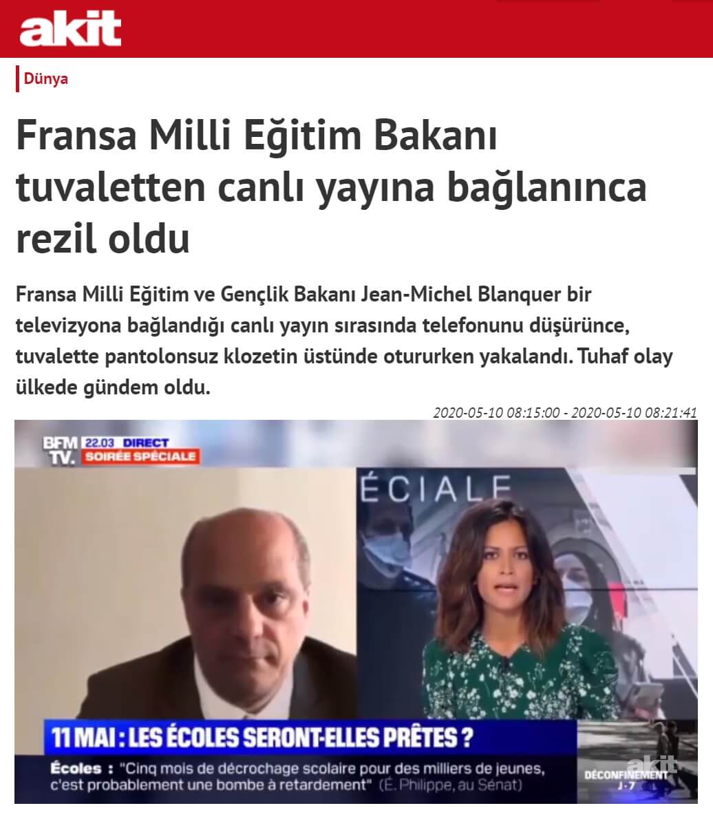 Fransa Milli Eğitim ve Gençlik Bakanı Jean-Michel Blanquer bir televizyona bağlandığı canlı yayın sırasında telefonunu düşürünce, tuvalette pantolonsuz klozetin üstünde otururken yakalandı.”