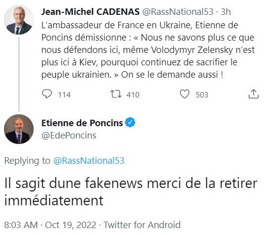 Fransa’nın Ukrayna Büyükelçisi Etienne de Poncins’in Ukrayna Devlet Başkanı Volodimir Zelenskiy’i eleştirerek görevinden istifa ettiği yönündeki asparagas geçtiğimiz günlerde sosyal medyada dolaşıma sokulmuş.