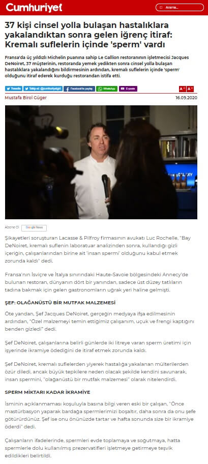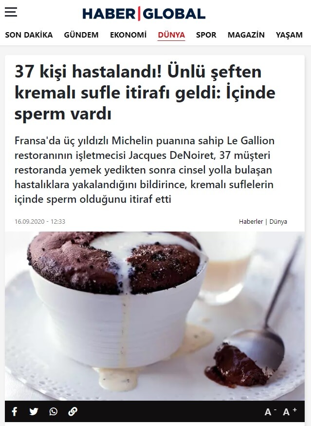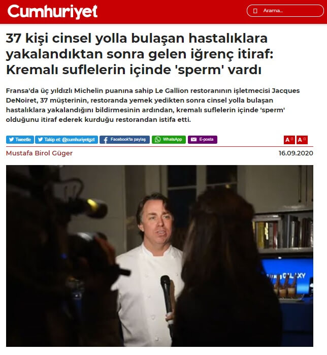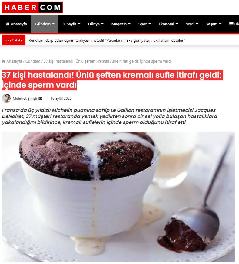 Haber sitelerinin hız yarışının kalite yerine seviyesizliğe yol açtığının yeni bir nişanesini konu edineceğiz: Fransa’da 3 Michelin yıldızlı restoran şefinin restoranında müşterilerine sunduğu krem sufleye sperm koyduğu, bu nedenle 37 müşterinin cinsel yolla bulaşan hastalığa yakalandığı, Fransız şefin krem sufleye sperm koyduğunu itiraf ettiği ve kurduğu restorandan istifa ettiği iddiası.