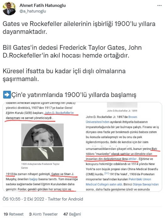 “Gates ve Rockefeller ailelerinin işbirliği 1900’lu yıllara dayanmaktadır. Bill Gates’in dedesi Frederick Taylor Gates, John D.Rockefeller’in akıl hocası hemde ortağıdır. Küresel ifsatta bu kadar içli dışlı olmalarına şaşırmamalı.