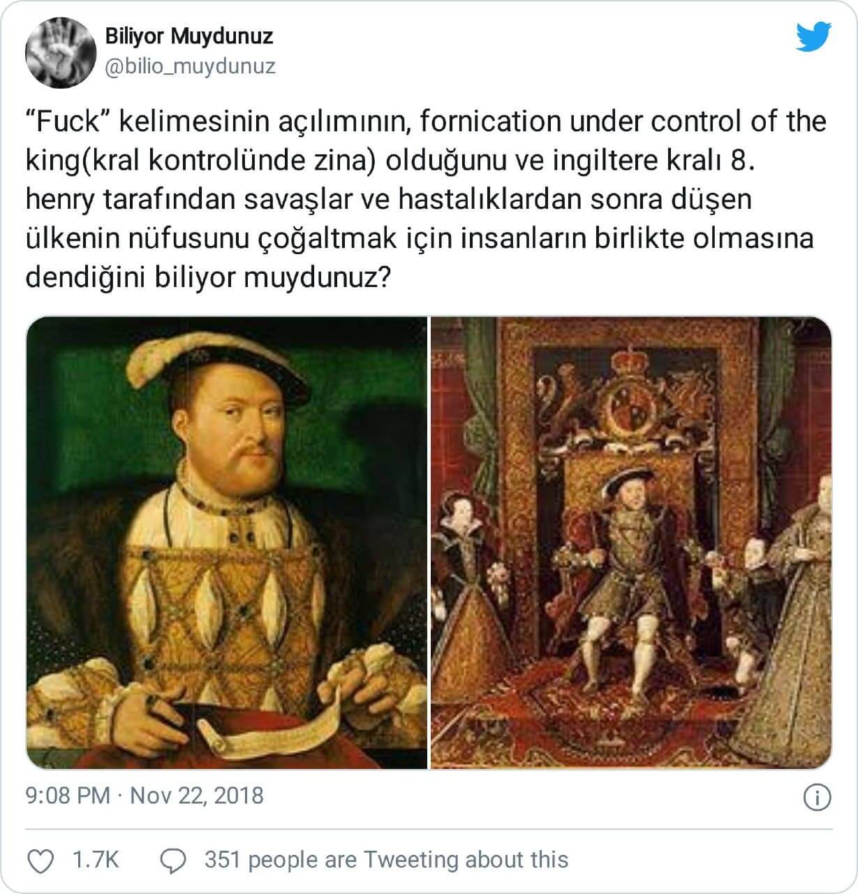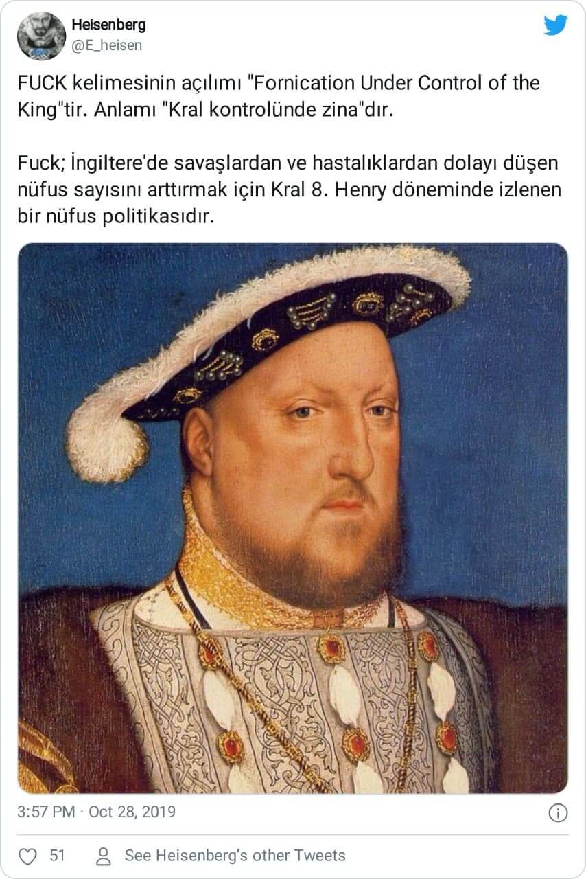““Fuck” kelimesinin açılımının, fornication under control of the king(kral kontrolünde zina) olduğunu ve ingiltere kralı 8. henry tarafından savaşlar ve hastalıklardan sonra düşen ülkenin nüfusunu çoğaltmak için insanların birlikte olmasına dendiğini biliyor muydunuz?”