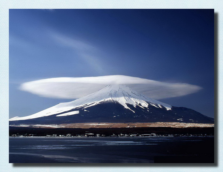 Fuji Dağı ve Tepesindeki Katmanlı (Mercek / Lentiküler) Bulut Fotoğrafı Montaj Ürünüdür