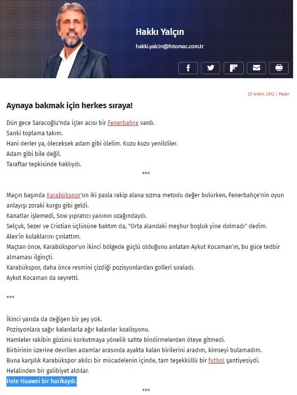 Hakkı Yalçın, Fotomaç’ta 23 Aralık 2012 tarihinde yayımlanan “Aynaya bakmak için herkes sıraya!” başlıklı yazısında, Karabük Spor’un kadrosundan bihaber şekilde “Golün adı Huawei” reklâmını görüp Huawei’yi Karabüklü futbolcu sanıp bir de performansı hakkında yorum yapmıştı.
