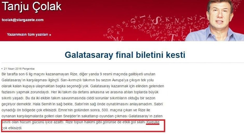 Galatasaray’ın Çaykur Rize Spor ile yaptığı maçı yorumlayan bahse konu yazısında, sakatlığı nedeniyle haftalar önce sezonu kapatan Çaykur Rizesporlu Kweuke için ‘etkisizdi’ yorumu yapması, maçı izlemeden “afaki” bir yorum yaptığı kuşkusunu doğurmuştu: