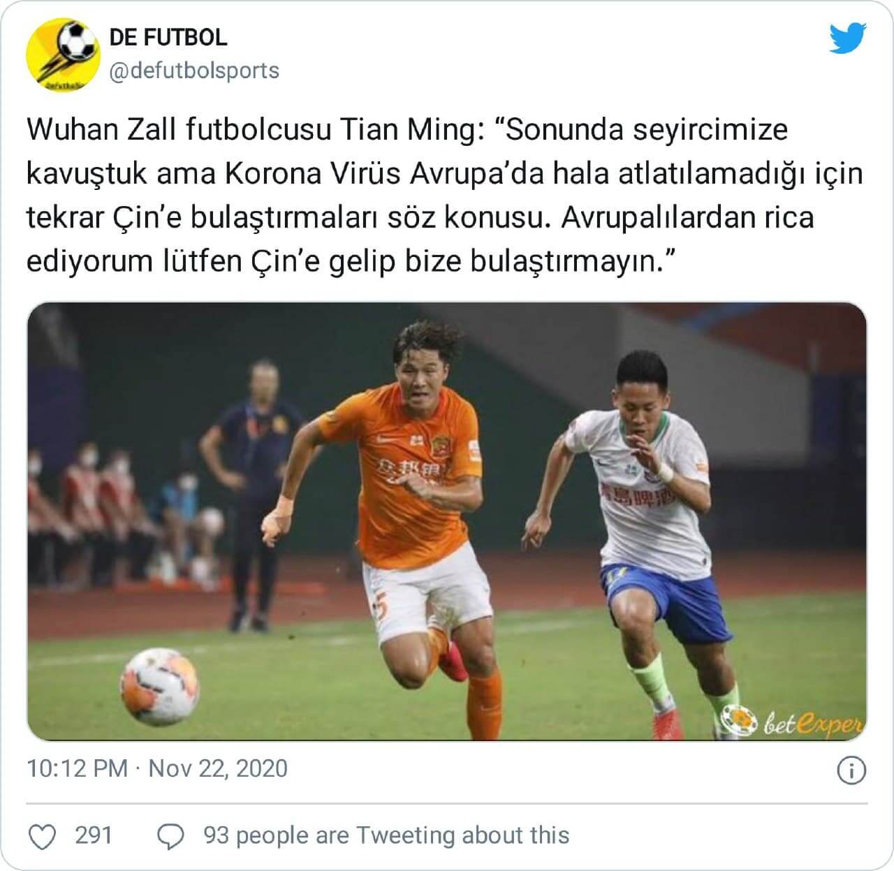 Çinli futbolcu Tian Ming’e atfedilen “Koronavirüs Avrupa’da hâlâ atlatılamadığı için tekrar Çin’e bulaştırmaları söz konusu. Avrupalılardan rica ediyorum lütfen Çin’e gelip bize bulaştırmayın” sözü de bir parodi profilin uydurmasıydı.