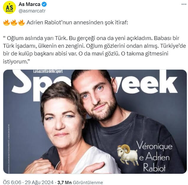 Fransız millî futbolcu Adrien Rabiot’nun annesi Veronique Rabiot’ya atfen “Oğlum aslında yarı Türk. Bu gerçeği ona da yeni açıkladım. Babası bir Türk işadamı, ülkenin en zengini. Oğlum gözlerini ondan almış. Türkiye’de bir de kulüp başkanı abisi var. O da mavi gözlü. O takıma gitmesini istiyorum.” sözleri (As Marca adlı troll hesap tarafından) uydurulmuş. Rabiot’nun babası Michel Provost 2007 yılında felçli kaldıktan sonra 2019 yılında vefat etmiş.