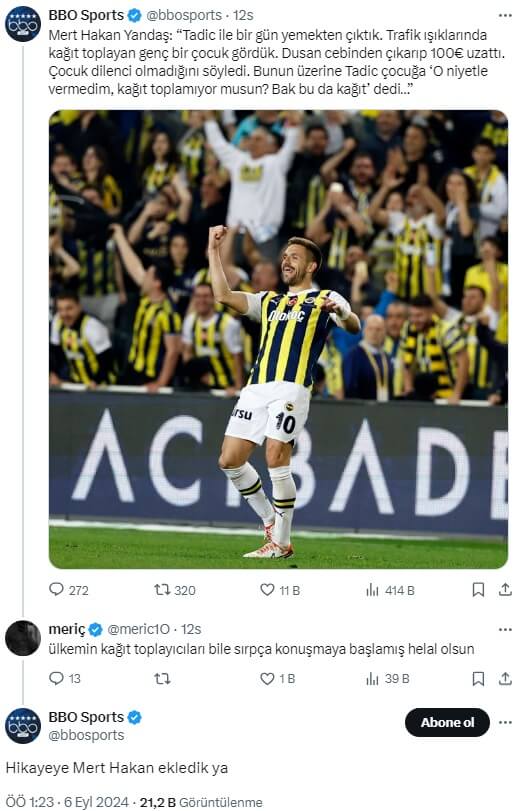 BBO Sports bu defa Mert Hakan Yandaş’tan rivayetle Tadic’in kağıt toplayıcı çocuklara kağıt para vermeye çalıştığı HİKÂYEsini uydurmuş.