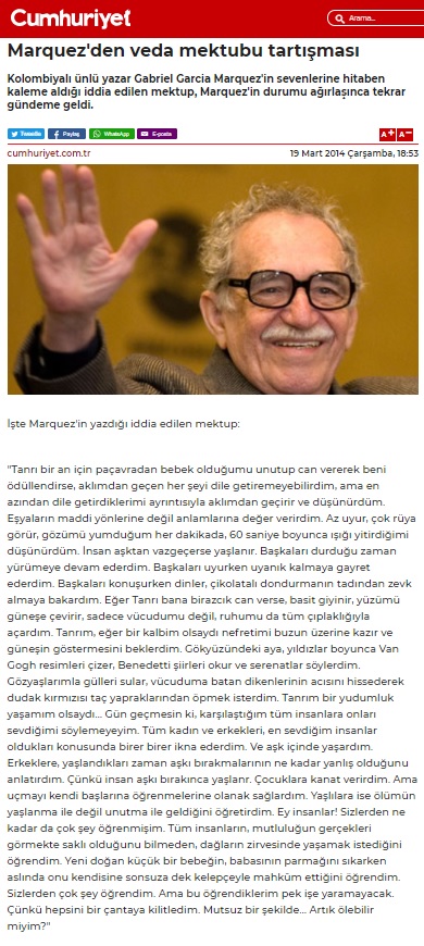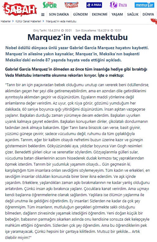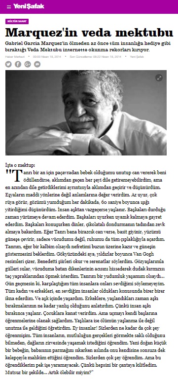- Can Ertan – Bursahaber.com – “Marquez’in veda mektubu” – 9 Nisan 2014