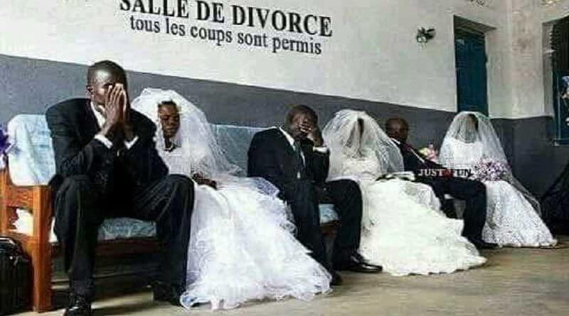 Kurgu içerikte kullanılan fotoğrafta gelinlik ve damatlık giyen çiftlerin arkasındaki duvarda Türkçemize “Boşanma odası – her şeye izin var” olarak çevrilebilecek Fransızca “Salle de Divorce – tous les coups sont permis” notunun yer aldığı görülebiliyor.