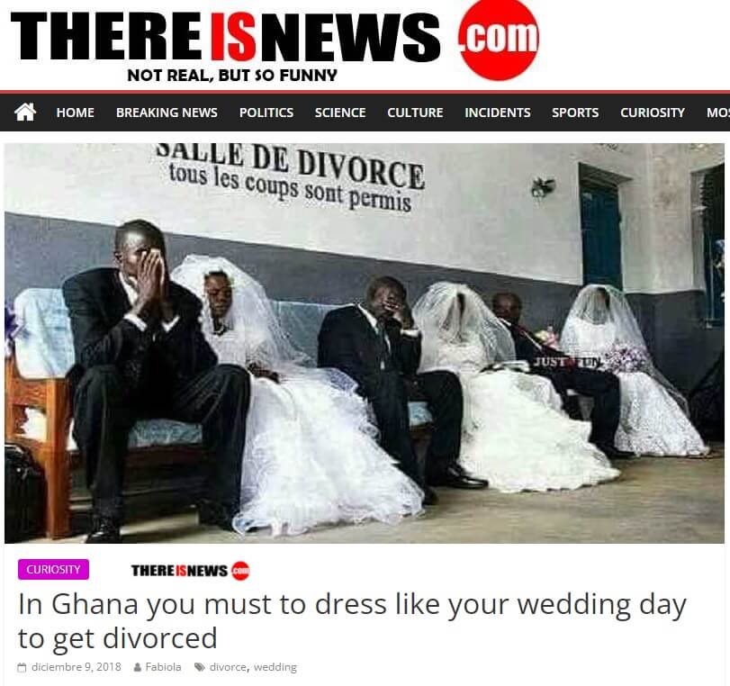 İddianın kaynağı thereisnews.com adlı parodi içerik sitesindeki 9 Eylül 2018 tarihli “Gana’da boşanmak için evlendiğiniz günkü gibi giyinmek zorundasınız” (“In Ghana you must to dress like your wedding day to get divorced“) başlıklı yazıya dayanıyor. “Gerçek değil, fakat çok eğlenceli” (“not real, but so funny”) sloganıyla yayın yapan “There is news” adlı internet sitesinin bu aktarımı gerçeğe dayanmıyor. Sitede paylaşılan metnin alt bölümünde “Bilgi: Yasal uyarımızda okuyabileceğiniz üzere There Is News içeriği kurgudur.” (“ADVICE: The content of There Is News is fiction, as you can read in our Legal Warning“) notunun yer aldığı görülebiliyor.