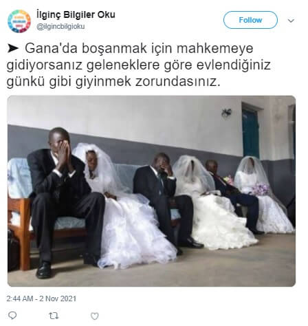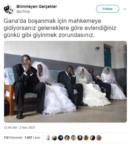 Gana’da boşanmak için mahkemeye gidildiğinde geleneklere göre evlenildiği günkü gibi giyinmek zorunda olunduğu yönünde yanlış bir “bilgi”, “bilgi” aktardığı iddiasıyla faaliyet gösteren sosyal medya profilleri öncülüğünde yayılagelmekte.