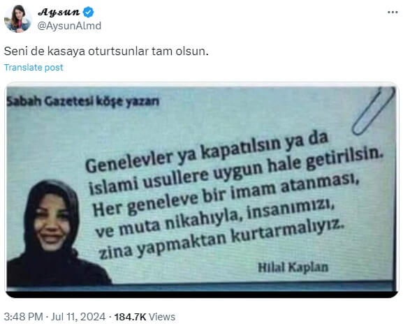 Genelevler ya kapatılsın ya da İslami usullere uygun hale getirilsin. Her geneleve bir imam atanması ve muta (kısa süreli evlilik) nikâhıyla, insanımızı, zina yapmaktan kurtarmalıyız…” sözleri Hilâl Kaplan’a ait değil.