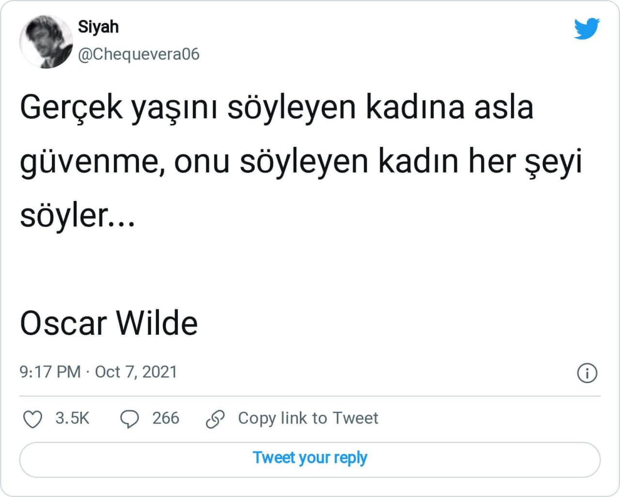 “Gerçek Yaşını Söyleyen Kadına Asla Güvenme, Onu Söyleyen Kadın Her Şeyi Söyler.” Sözü Oscar Wilde’ın “Önemsiz Bir Kadın” Adlı Kitabında Lord Illingworth Adlı Karakter İçin Yazdığı Bir Replik