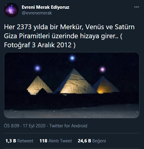 Ertan Özyiğit (@ErtanOzyigit): “Mısır’daki Giza piramitlerinin üzerindeki Merkür, Venüs ve Satürn. 2373 yılda bir gerçekleşir. Ve yine gerçekleşiyor”