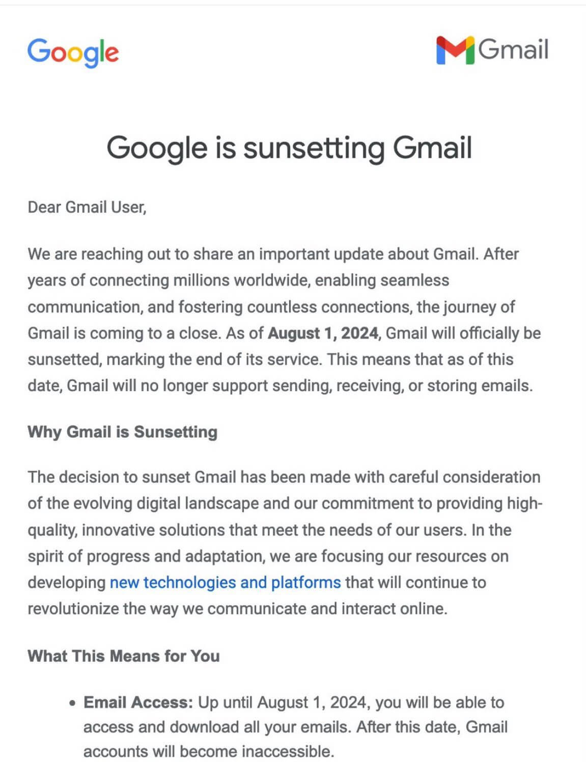 Google’ın popüler e-posta servisi Gmail’i kapatacağına dair bu duyurunun da Google’ın geçmişte sonlandırdığı kayda değer sayıdaki özelliği eleştiren hicivsel bir deneme olduğu anlaşılıyor.