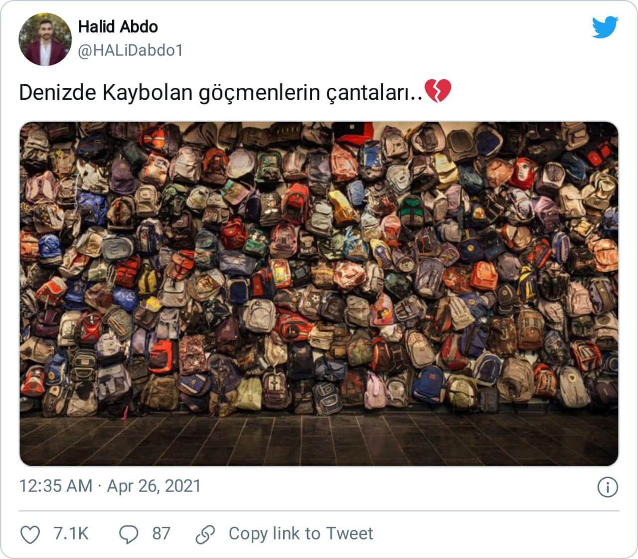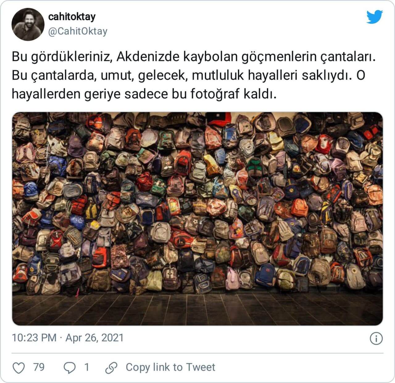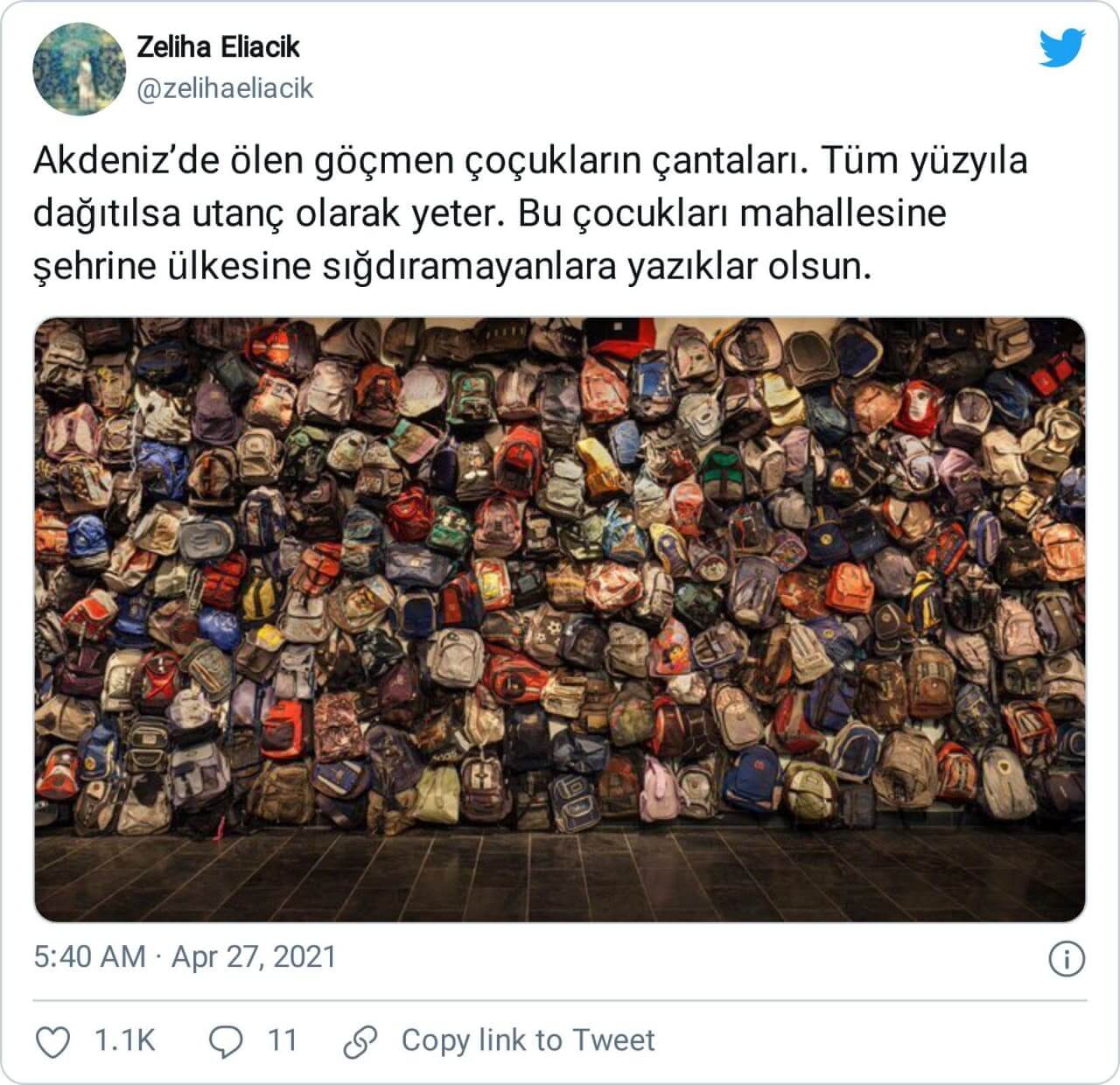 “Akdeniz’de ölen göçmen çocukların çantaları. Tüm yüzyıla dağıtılsa utanç olarak yeter. Bu çocukları mahallesine şehrine ülkesine sığdıramayanlara yazıklar olsun.”