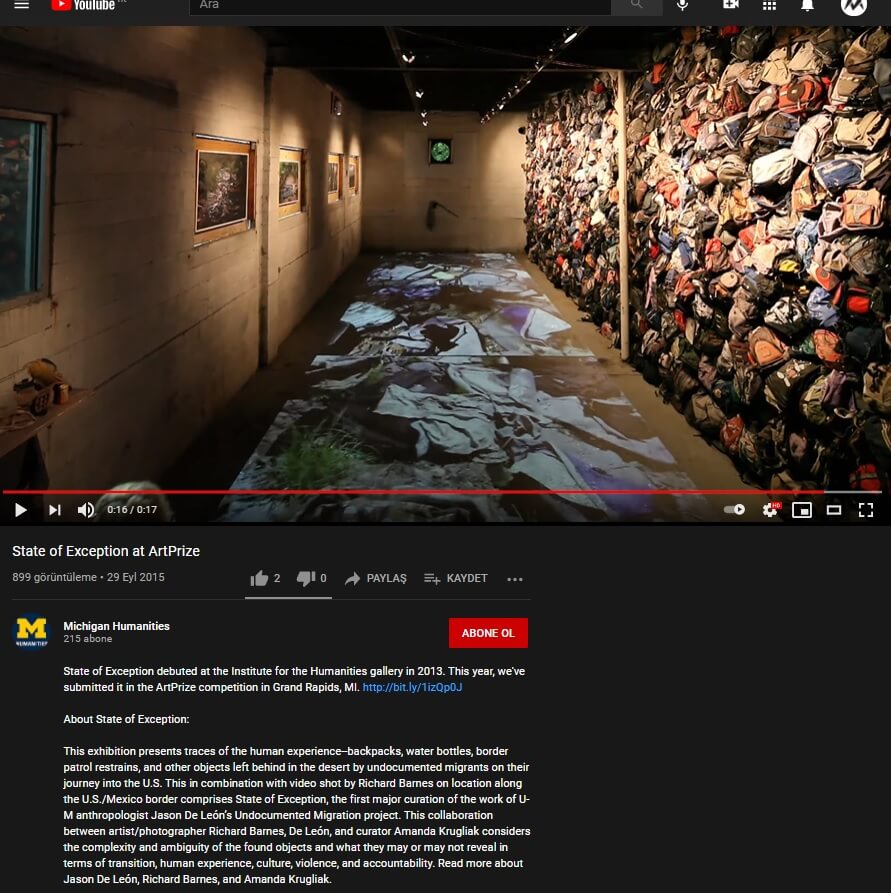 Michigan Üniversitesi’nden antropolog Jason De Léon tarafından yürütülen “Kaçak Göç” (“Undocumented Migration”) adlı proje kapsamında toplanan sırt çantaları Richard Barnes ve Amanda Krugliak adlı sanatçılar tarafından bir araya getirilerek “State of Exception/Estado de Excepción” adlı sergide sunulmuş.