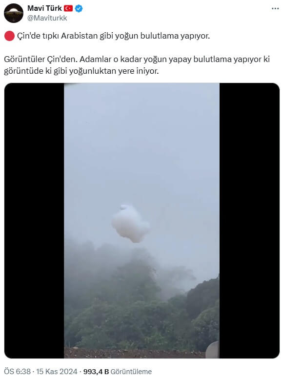 Mavi Türk (@Maviturkk): “Çin’de tıpkı Arabistan gibi yoğun bulutlama yapıyor. Görüntüler Çin’den. Adamlar o kadar yoğun yapay bulutlama yapıyor ki görüntüde ki gibi yoğunluktan yere iniyor.”