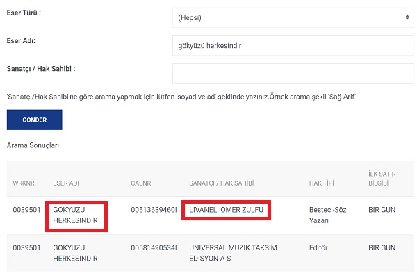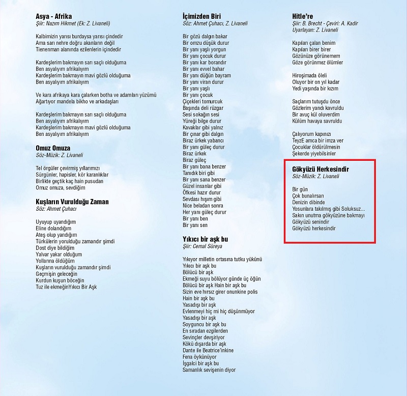 Türkiye Musiki Eser Sahipleri Meslek Birliği (MESAM) internet sitesinde yaptığımız eser taramasında da “Gökyüzü Herkesindir” adlı parçanın söz yazarının Zülfü Livaneli olduğunun belirtildiği görülmektedir.
