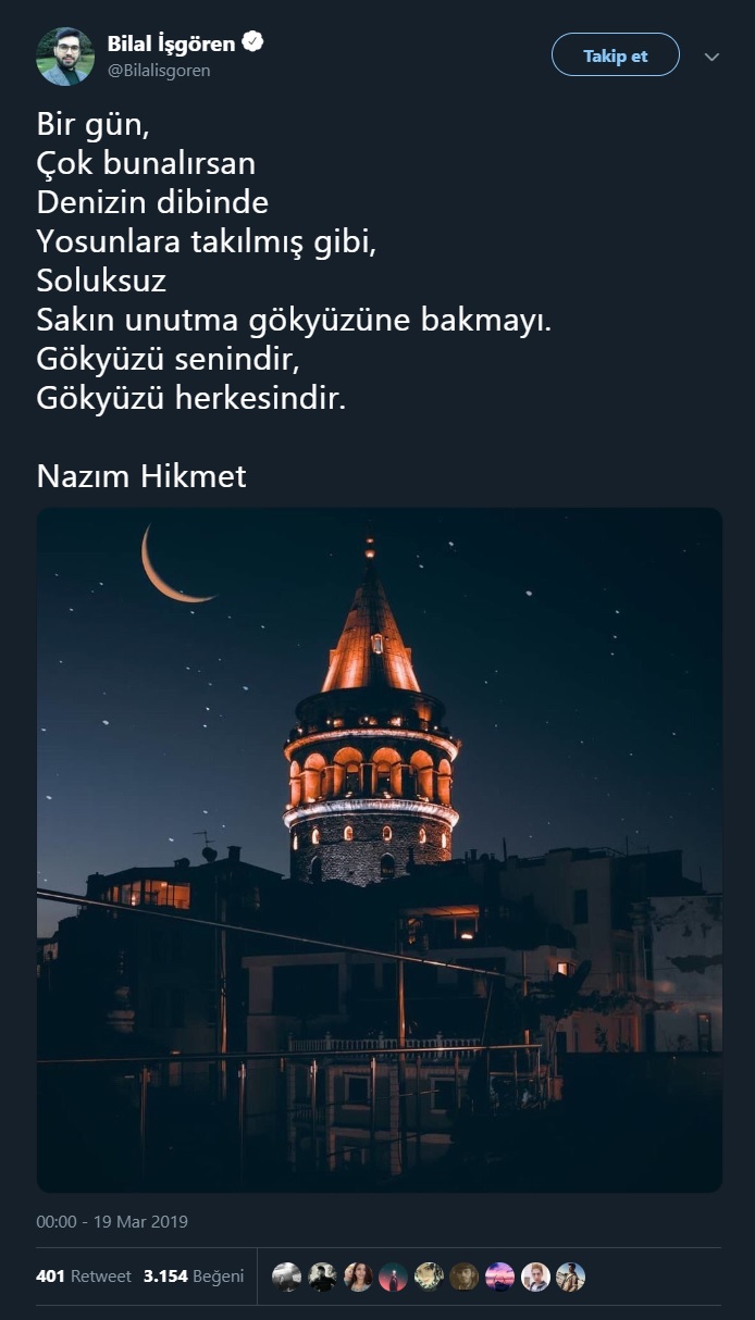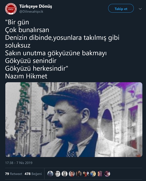 "Tam da bu ara noktada durup da Nazım Hikmet’i anmamak olur mu ? Ne demiş Nazım ? … “Bir gün çok bunalırsan, denizin dibinde yosunlara takılmış gibi, soluksuz ! Sakın unutma gökyüzüne bakmayı… Gökyüzü senindir, gökyüzü herkesindir…”"
