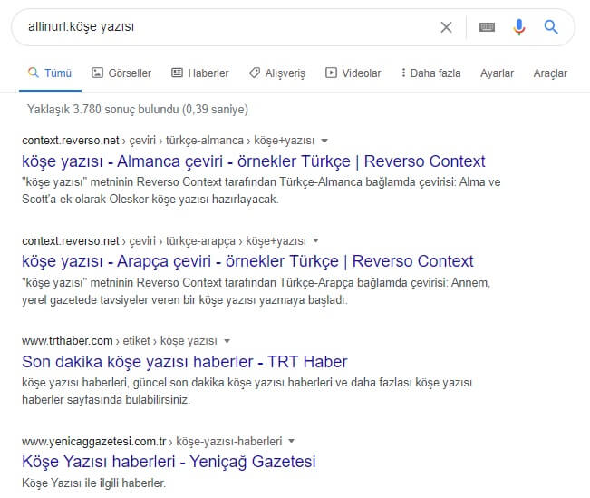 Örneğin: inurl:nutuk ya da allinurl:köşe yazısı