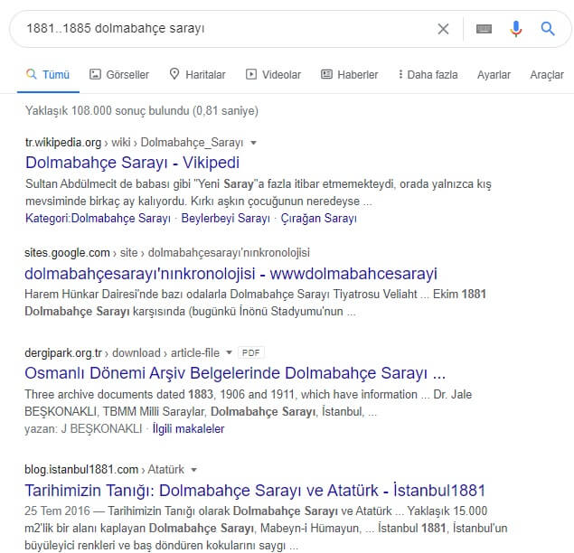 Ayrıca bu, belirli yıllar arasından arama yapmak için de faydalı bir yol. Başlangıç ve bitiş yılı arasına iki nokta yerleştirerek ilgili yıl aralığını barındıran sonuçlara erişilebilir.