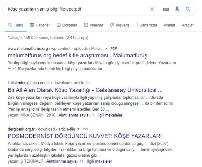 Örneğin: köşe yazarları yanlış bilgi filetype:pdf ya da bütçe açığı filetype:ppt