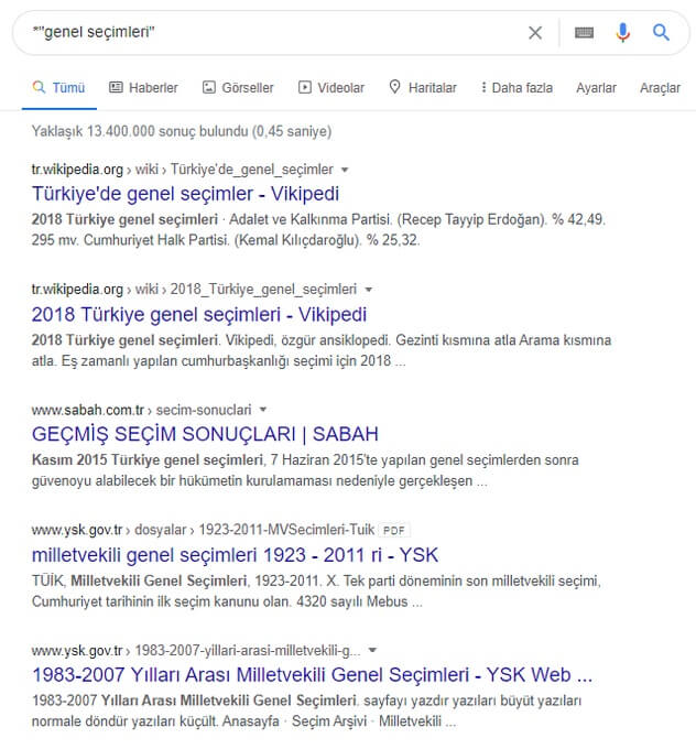 Google’da arama yaparken belki de en sık kullanılan özellik… Spesifik arama için çift tırnağa (“…”) başvuruyoruz. Arama sonuçlarında bir ifadenin birebir aynısının karşımıza çıkmasını istiyorsak, ilgili ifadenin çift tırnak arasında yazılması gerekiyor. Böylelikle, çift tırnak içerisinde yer alan kelimeler belirtildiği sıra ve şekilde arama sonuçlarında yer alacaktır.