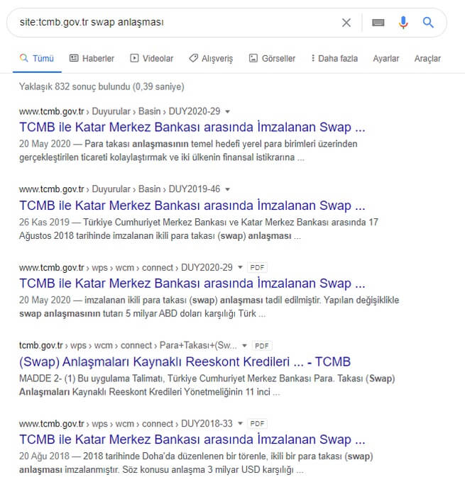 Örneğin: site:tcmb.gov.tr swap anlaşması