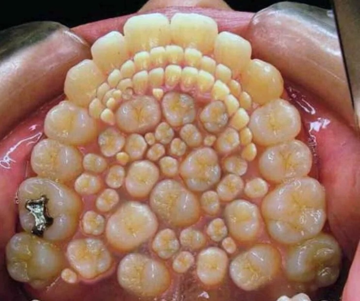 Ağızda normal diş sayısından çok daha fazla diş bulunması durumu anlamına gelen hiperdonti (hyperdontia) vakası olduğu iddiasıyla paylaşılan fotoğraf montaj eseridir. Paylaşılan fotoğraf, sağlıklı bir ağza ait görüntünün üzerinde oynanarak damak bölümüne ilave diş eklenmesiyle oluşturulmuştur.