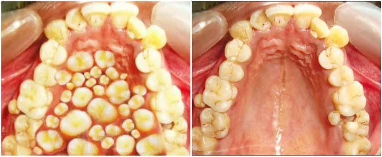 Bireylerin ağzında normalden fazla diş çıkması durumuna dair tek görsel fotoğraf yukarıdaki görsel değil. Aşağıdaki karşılaştırmada da görülebileceği üzere, gerçekten hiperdontiye sahip bir kişinin ağzına ait (sağdaki) fotoğraf üzerinde oynama yapılarak damak tamamen dişle doldurularak daha anormal bir durum lanse edilmeye çalışılmış.