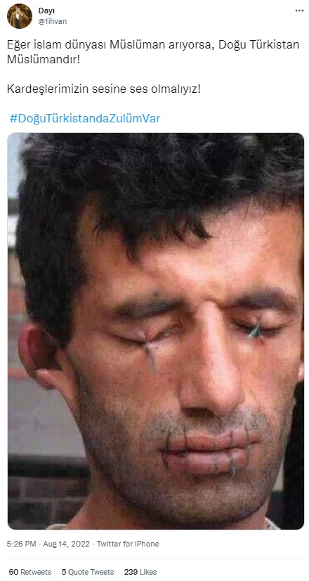 Son günlerde sosyal medyada, Çin’in Doğu Türkistan’da uyguladığı politikaları yansıttığı vurgusuyla bir erkeğin göz kapaklarının ve dudaklarının dikilmiş vaziyette görüldüğü fotoğrafın yaygın şekilde paylaşıldığına şahit oluyoruz.