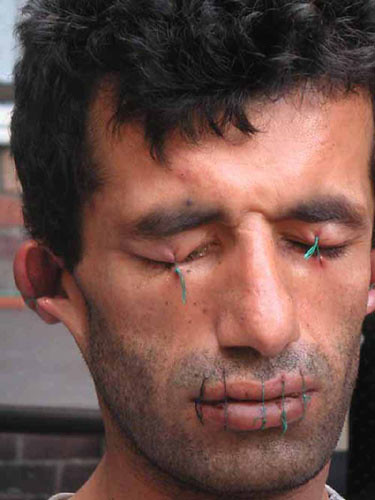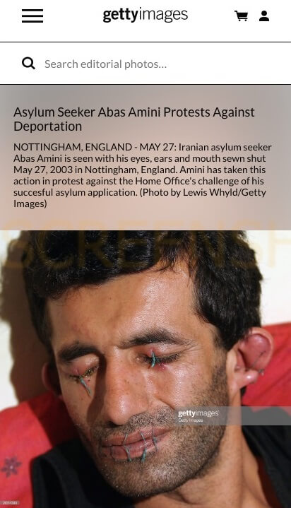 Abas Amini, İran’daki hapishaneden kaçarak sığınma başvurusunda bulunduğu İngiltere’den sınır dışı edilme tehdidini protesto etmek için 25 Mayıs 2003 tarihinde göz kapaklarını, dudaklarını ve kulaklarını dikmişti (Abas Amini’nin (Emin Abas) İran’ın Kürtçe şiiri yazmasını yasaklaması üzerine gözlerini ve ağzını dikerek tepki gösterdiği yönündeki yanlış iddia da ileri sürülmüştü).