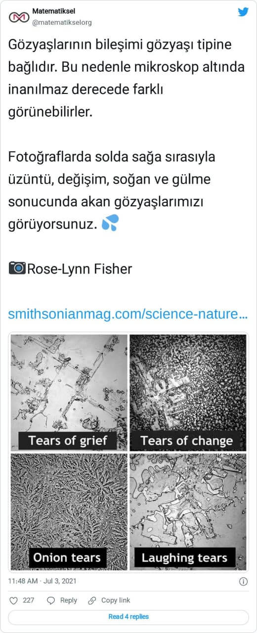 “Gözyaşlarının bileşimi gözyaşı tipine bağlıdır. Bu nedenle mikroskop altında inanılmaz derecede farklı görünebilirler. Fotoğraflarda solda sağa sırasıyla üzüntü, değişim, soğan ve gülme sonucunda akan gözyaşlarımızı görüyorsunuz. 💦