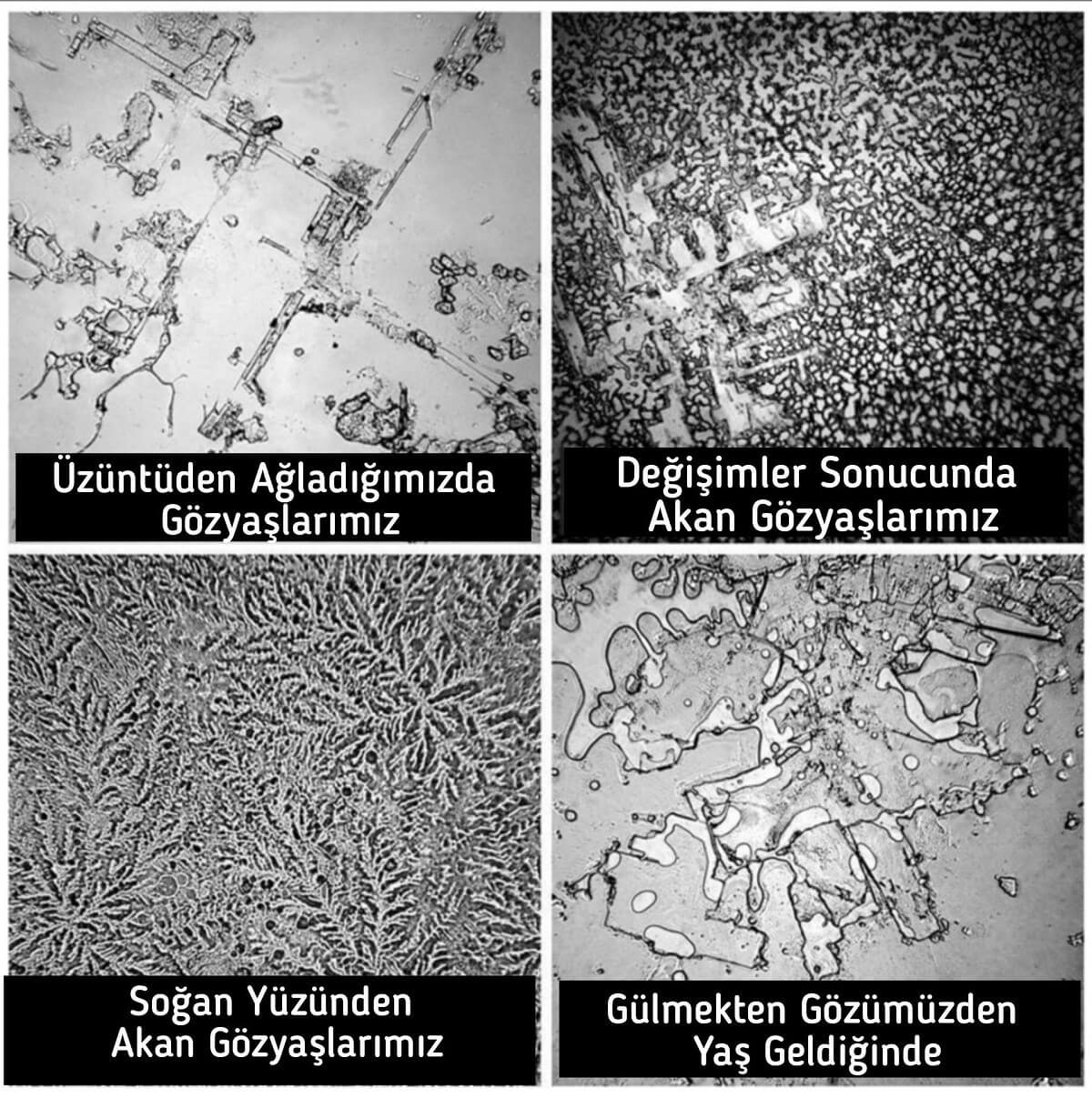 Mikroskopla görüntülenen gözyaşları farklı duyguların ardından dökülmüş. Ancak, farklı duyguların etkisiyle dökülen gözyaşlarının aynı yapı kalıplarına sahip olduğu doğru değil. Bir duygunun neden olduğu gözyaşlarının diğerlerinden “yapısal olarak farklı” olduğu gerçeği yansıtmıyor.
